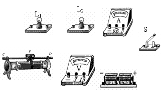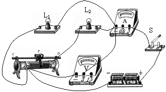 设计题:如图6-27所示,有灯泡L1、L2,开关S,电源,电压表、电流表,滑动变阻器和导线若干,要求:L1、L2并联,开关控制整个电路,电流表测总电流,电压表测L1的电压,滑动变阻器改变通过L2的电流。请画出电路图并连接实物图。