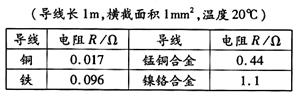 1.根据下表中数据回答:安装家庭电路取用导线时,应从铜线和铁线中,选用______________线。制作一个滑动变阻器,选择电阻线材料时,应从锰铜合金和镍铬合金中,选用______________。