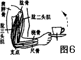 图6所示,人的前臂可视为杠杆,当曲肘将茶杯向上举起时,下列说法中正确的是( )