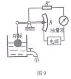 如图9所示,表示一种自动测定油箱内油面高度的装置。R是滑动变阻器,它的金属片是杠杆的一端。从油量表(由电流表改装而成)指针所指的刻度,就可以知道油箱内油面的高度。
