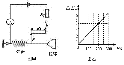 16. 为锻炼身体,小明利用所学物理知识设计了一个电子拉力计,图甲是原理图。硬质弹簧右端和金属滑片P固定在一起(弹簧的电阻不计,P与R1间的摩擦不计)。定值电阻R0=5Ω,a、b是一根长为5cm的均匀电阻丝,阻值Rab=25Ω,电源电压U=3.OV,电流表的量程为 O-0.6A, 当不拉拉环时,金属滑片P刚好处于a端.已知该弹簧伸长的长度ΔL与所受拉力F间的关系如图乙所示。