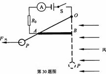 17.小明同学设计的“风力测试仪”在校科技节上备受师生们的青睐,“风力测试仪”的原理如图所示.电源电压6V,R0为保护电阻,AB为长20cm、阻值为50W的均匀电阻丝.OP为质量、电阻均不计的金属细杆,下端连接一个重为2N的球P.闭合开关S,无风时,OP下垂并与电阻丝的B端接触;有风时,球P受风力的作用,使金属细杆OP绕悬挂点O偏转,当偏转到电阻丝的A端时,电流表示数为0.6A.已知悬挂点O与电阻丝B端的距离为10cm,金属细杆OP始终与电阻丝AB接触良好且无摩擦,求: