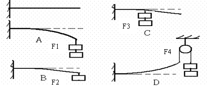 某同学研究力的作用效果与力的那些因素有关,如图所示,用力拉一根锯条,使其发生图中A、B、C、D 四种形变,其中F1=F3=F4>F2。则: