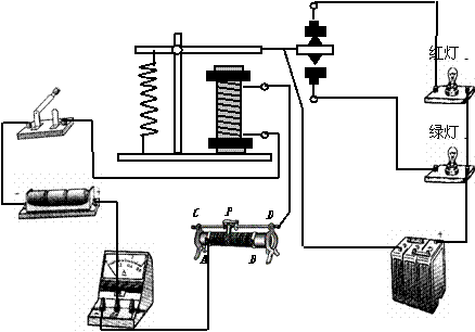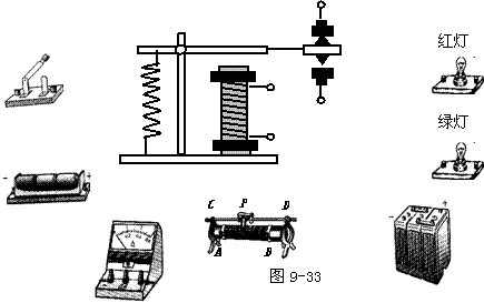 2.如图9-33所示,给你如下器材:电磁继电器一只,红、绿灯各一个(均标有“6v,0.8w”),开关-只,电流表一只,滑动变阻器一只(最大电阻2Ω),干电池-只(1.5v),蓄电池6v.请按下列要求画出电路图,并连接实物.