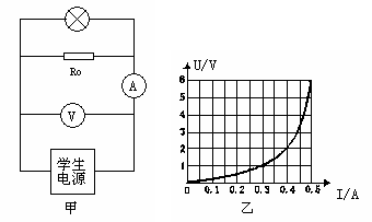 某物理兴趣小组同学设计了如图甲所示的电路图进行实验探究,电源为可调压直流学生电源,电压表量程为“0-15V”,电流表量程为“0-0.6A”,小灯泡标有“6V 1.2W”字样,Ro为20Ω的定值电阻。小组根据记录的电流表和电压表示数变化,描绘出U-I关系图,如图乙所示.
