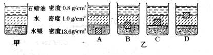 如图2甲所示,一只烧杯中盛有石蜡油、水和水银三种液体,液体之间不相溶合。将一实心铅块(铅的密度是11.3g/cm3)轻轻放人该烧杯中,图乙中能正确显示出铅块静止时位置的图是( )