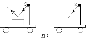 0 20 .如图7所示,一辆小车正在向左做匀速直线运动,车上有一水槽和与车固定的点光源S,点光源发出一束光线射向水面,当小车突然刹车时,水面将倾斜.请在下面右图中画出刹车时水槽中的水面大致位置并完成光路图.