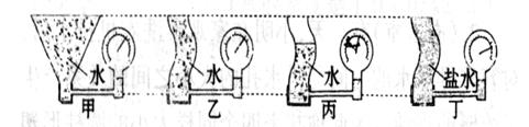 某小组同学用水、盐水、两种不同形状的容器和指针式压强计验证液体内部压强的规律。压强计指针顺时针偏转的角度越大,表示压强越大。他们的研究情况如图10甲、乙、丙、丁所示。(图12甲、乙、丁中的容器内均装满液体,且ρ盐水>ρ水)