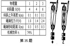 34、(★)(06广西桂林)如图所示是某小组在"测滑轮组机械效率"的实验中进行的一个探究活动。(1)负责记录的小强同学粗心大意漏记了一个实验数据,如下表,请你将漏记的实验数据补上;(2)实验中甲滑轮组做的有用功 ________乙滑轮组做的有用功(选填"大于"、 "等于" 或 "小于");甲滑轮组的机械效率为____________ ,乙滑轮组的机械效率为____________;(3)实验探究得出的结论是:______________________。