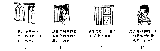B.雨后山上雾的形成 C.寒冷的冬天,室外潮湿的衣服结冰了 D.养鱼缸里的水一段时间后变浅了