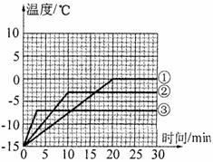 ( 08江苏常州)看到抢险队员在冰雪覆盖的道路上洒大量的盐, 小亮同学产生疑问:含盐浓度不同的冰,熔化特点有无区别?为此,小亮同学用纯水、淡盐水、浓盐水制得质量均为lkg的纯冰、淡盐冰、浓盐冰,在相同加热条件下测量三者的温度变化,并得到三条温度变化曲线(纯冰对应曲线①、淡盐冰对应曲线②、浓盐冰对应曲线③).根据曲线图 可知,含盐浓度越高的冰,比热容越