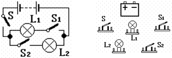L1和L2并联,请在右图中错误之处打上“×”,加以改正,并在空白处画出正确的电路图。