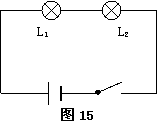 2、在探究串联电路电流规律时,教师刻意找来外表相同,但规格不同的两盏小灯泡L1和L2,连好电路如图15所示。闭合开关后,同学们发现L1比L2亮得多。