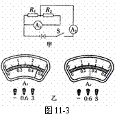 3.某同学在做“用电流表测电流”的实验中,所用电路11-3如图甲所示,按电路图正确连接电路并接通开关S后,电流表A1、A2的计数如图乙,则A1读数是 A;A2的读数是 A;那么R1:R2= 。