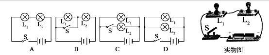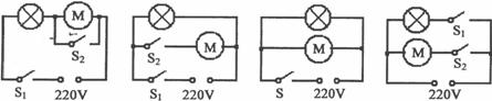 例6、一般家庭的卫生间都要安装照明灯和换气扇。使用时,有时需要各自独立工作,有时需要它们同时工作。在下图所示的电路,你认为符合上述要求的是( )