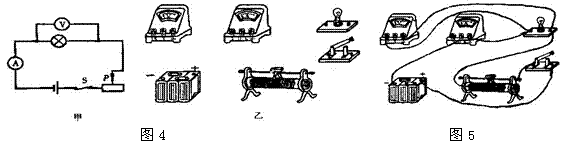 [例题4]如图4甲是用伏安法测小灯泡电阻的实验电路图,已知滑动变阻器的阻值范围是0∽10Ω,电源电压为6V。电压表和电流表均为双量程学生用电表.灯的阻值大约为10∽15Ω,实验时电压表和电流表应分别选用说明量程?将图4乙的实物根据要求连成电路.若开关闭合时,电压表的示数为3V,要使灯两端电压为4V,滑动变阻器的滑片如何移动?为什么?