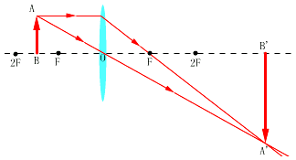 (2)、幻灯机、投影器、电影放映机--物体处于2倍焦距和1倍焦距之间,成倒立放大实像。