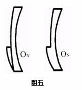 图五为近视眼镜的胶合平顶(一线)双光和整体一线双光,设近用视心为ON,在近用区由于子镜片和主镜片在垂直方向上的棱镜基底方向相反,部分棱镜度相互抵消,因而子镜片的光心在垂直方向上有可能位于近用光区内,也就是说距离视心ON较近(理想状态是光心与视心重合),近用光心与近用视心距离越近,所产生的棱镜效果(象位移)越小。