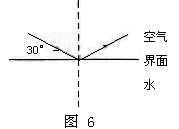 20. (操作性实验)一束光线从空气斜射入水中,在界面上发生了反射和折射,如图6所示,请在图中标出反射角及其大小;画出折射的大致光路。