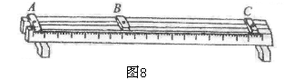 22. (观察性实验)在“观察凸透镜成像”的实验中,光具座上的A、B、C三个滑块用于放置凸透镜、光屏或蜡烛(图8),其中在B上应放置_____________,器材装好后,若某同学在实验中固定了B,无论怎样移动A和C,在光屏上都找不到像,则原因是________________________________________________________________________。