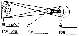 12.古代时,由于无法解释日食成因,人们迷信地认为日食是-种凶兆。现在我们可以用光的___________来解释日食的成因,如图6所示。有乒乓球、足球和瓦数较大的白炽电灯,请你用这三种物品代表相应的星球,设计出观察日食成因的实验,并根据三个星球排列的位置,按示例,把答案填写在图中的横线上。