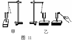 如图11甲所示,用竖直悬挂的泡沫塑料球接触发声的音叉时,泡沫塑料球被弹起,这个实验是为了验证__________________________;如图11乙所示,敲击右边的音叉,左边完全相同的音叉把泡沫塑料球弹起,这个实验是为了验证___________________________.