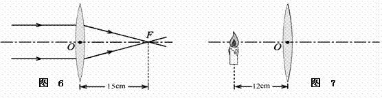 (2)一束平行光线经过凸透镜折射后的传播方向如图6所示,由图可知,此透镜的焦距为