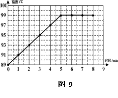 在“观察水的沸腾”实验中,当水温升到89℃时,小刚开始计时,每隔1min记录一次水的温度.然后,小刚根据实验数据绘制了如图9所示的温度随时间变化的图像.由图像可以看出,把水从89℃加热到刚开始沸腾所需时间为________ min;根据图像可以推断,如果在其它条件不变的情况下继续对水加热1min,则水的温度是______℃.