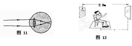 (2)校医务室检查视力时,因房间太小而使用一个平面镜,让学生看视力表在平面镜中所成的像.视力表到镜子的距离为2.8m,视力表的像到平面镜的距离为 m,如图12所示,而体检要求人与视力表距离应为5m,则该同学所在位置距镜子的距离应为 m. ![]()