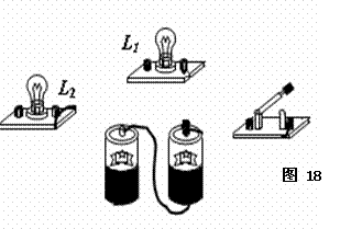 (2)将图18中的电池、开关、灯泡L1和L2用导线连接起来组成并联电路,要求开关接入L1支路只控制L1,并在方框中画出相应的电路图.