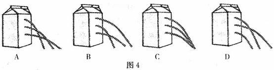 13.( )在空纸盒的侧面扎三个大小一样的孔。纸盘装满水后,水从小孔喷出,图4中最接近实际情况的是