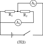 5、如图(3)所示,R1=3Ω,R2=9Ω,当开关闭合时,电流表A1、A2的示数之比为