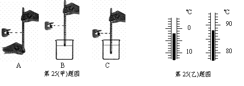 25.使用温度计时,首先要观察它的_____________和认清它的分度值。小明用温度计测量烧杯中液体的温度,分别进行了三次操作,如图(甲)所示,其中正确的操作是______________。图(乙)中所示的是用温度计分别测得的冰和水的温度,那么冰的温度是____________℃,水的温度是___________℃。