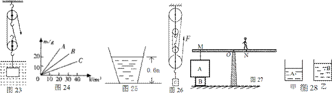 33.如图24所示是A、B、C三种物质的质量m与体积V的关系图线。由图可知A、B、C三种物质密度ρA、ρB、ρC之间的大小关系是( )