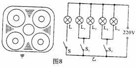 24、小明家的浴室新安装了一台可供冬季取暖和照明的电器,俗称“浴霸”,如图8甲所示,它的简化电路图如图8乙所示,其中L为标有“220V 40W”照明灯,L1、L2、L3、L4均标有“220V 300W”的红外线取暖灯。问: