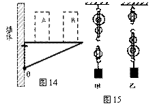某同学在安装滑轮组时,发现实验桌上只有两种滑轮,一种是轮框中只有一个滑轮,另一个种轮框中只有两个滑轮,而且每种只有一个。现在想设计一个最省力的绕绳的方法。请你在右图15中的甲、乙中只选一个装置,进行绕绳;使得绕完绳后是由这两种滑轮组装后最省力的绕法。