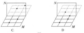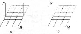 3如下图所示,M是一个放在桌面上的方格盘,N是垂直于盘面的一块玻璃板。盘中有两粒黑色棋子,它们在玻璃板中所成的像应是图中的