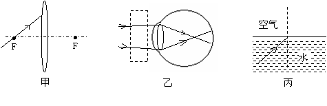 2在下图的图甲中画出经凸透镜折射后的光线;在图乙方框内填入能矫正视力的透镜;在图丙中画出折射光线的大致方向。