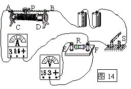 22.(6分)为了测量电阻R的阻值,某同学连接实验器材的线路如图14所示,请指出连接线路中的三个错误及其纠正的做法: