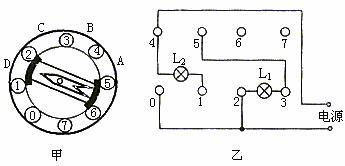 25. 图17甲是一个多档位旋转开关,图17乙是其控制两盏灯的工作原理图。如图甲所示,旋转开关内有一块绝缘圆盘,在圆盘的边缘依次有0,1,2,……7共8个金属触点(在图乙中用“○”表示);可以绕中心轴转动的开关旋钮两端各有一个金属滑片,转动开关旋钮可以将相邻的触点连接。例如,图甲中,旋钮上的箭头指向图中位置D,此时金属滑片将1、2两触点接通,同时也将5、6两触点接通。当旋钮上的箭头指向A、B、C、D不同位置时,可以实现四种功能,即只有灯泡L1亮、只有灯泡L2亮、灯泡L1L2同时亮以及电路断开。现在,旋钮上的箭头指向位置D,此时的电路工作情况是________。若要实现两灯同时亮,应将旋钮上的箭头指向位置________________。
