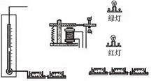 26、如图所示是小明设计的温度自动报警器原理图。在水银温度计里封入一段金属丝,当在正常工作的温度范围内时,绿灯亮;当温度升高达到金属丝下端所指示的温度时,红灯亮,发出报警信号.请按照题意要求,在图中连接好电路。