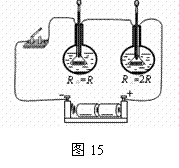 如图15是 “探究电流通过导体产生的热量与导体电阻间关系”的实验装置,两阻值分别为R和2R的电阻丝浸在相同质量和初温的煤油中,每一烧瓶里各插入一温度计。请回答下列问题: