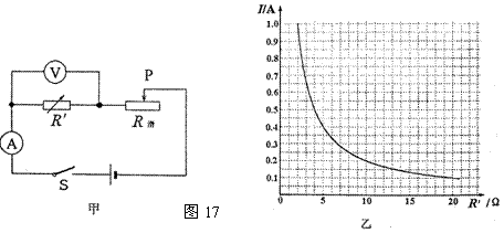 26、小明用图17-甲所示的电路,研究通过导体的电流与导体电阻的关系,电源电压恒为6V。实验过程中,他做了六次实验,每次改变电阻箱R'的阻值后,通过调节滑动变阻器始终保持R'两端的电压不变,记下相应的电流值。根据记录的六组数据,他在方格纸上描出了电流I与电阻箱阻值R'的关系图线,如图17-乙所示。