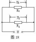 如图19所示,电阻R1和R2两端电压U1_______U2(填“>”、“=”或“<”);请利用欧姆定律推导并说明并联电路等效电阻的特点。