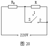 CFXB型“220V 1100W”电饭煲有两挡开关,其原理图如图20所示。“2”挡是高温烧煮,“1”挡是焖饭、保温。当开关S与接线柱2相连时,电路的功率是1100W;当开关S与接线柱1相连时,电路的总功率为22W。求: