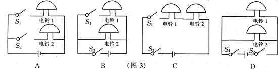 13.如图3,小明准备在前后门安装两只声音不同的电铃,希望能从铃声分辨出是前门来客还是后门来人,设计的电路图正确的是( )