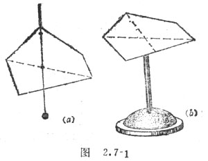 如图2.7-1(b)所示,将找出重心的不规则形状木板或硬纸板的重心放在支柱的顶尖上,可见不规则形状木板保持水平静止.