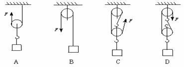4、在如图四所示的各种情况中,用同样大小的力将重物匀速提升,若不计摩擦和滑轮重,物重最大的是