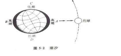 如图5-2所示,月球移到地球A点的上空,这时,A点上受到的月球引力最大,B点上的引力最小,因此此时这两处的引潮力都最大(B点的“引潮力”是地球转动的惯性离心力与月球引力之差,B点月球引力小,“引潮力”就大),而且都是垂直于地面向上的,所以这两点的海水上涨,出现了“涨潮”;面C点和D点的海水则向A、B两点流去,出现了“落潮”。同样原理,当月球移到C点或D点的上空时,C点和D点就出现了涨潮,而在A点和B点发生落潮。![]()