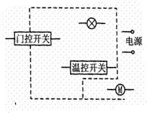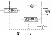 电冰箱内有照明灯,控制它的开关在打开冰箱门时闭合,使灯发光;当冰箱门关闭时,此开关处于断开状态,灯不发光。不妨我们把这种开关叫“门控开关”,用“-门控开关-”表示。电冰箱背面有一个电动压缩机,当冰箱内温度升高到一定程度便启动,而内部温度降到一定程度就会停止工作。因而我们可认为压缩机是由一个温控开关(用“-温控开关-”表示)自动控制的。
